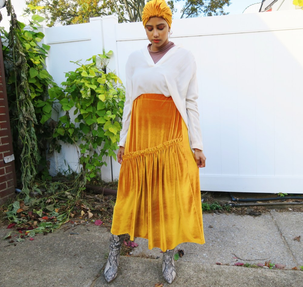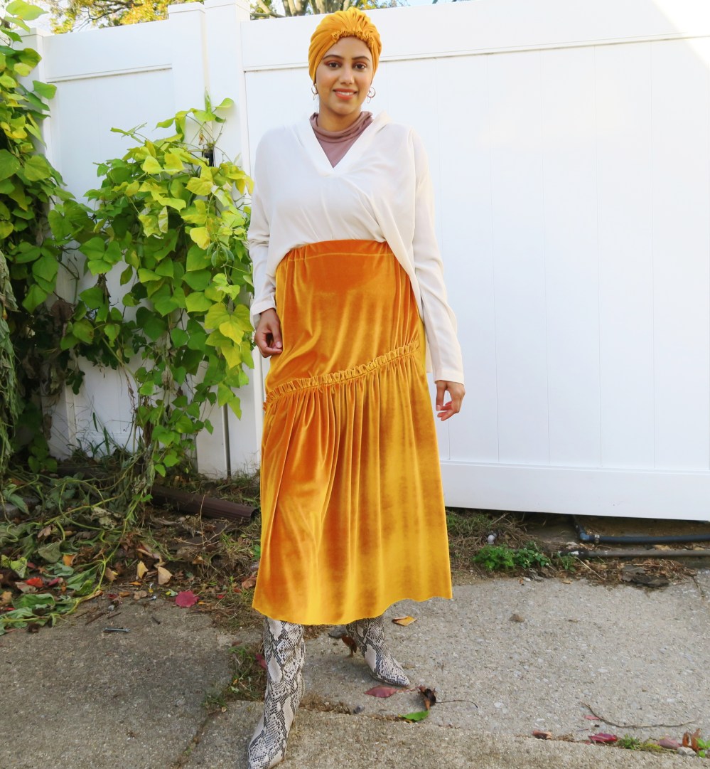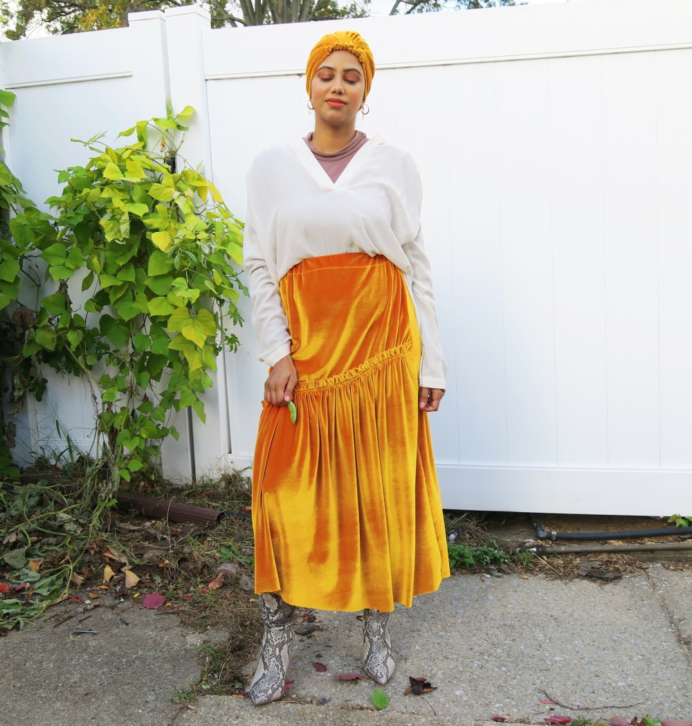 I resolved that I would make a skirt, that also fits the Tinted aesthetic! I knew exactly the design and fabric I wanted to use and got lucky and found this beautiful Honor Gold Stretch Velour fabric online at Mood. I purchased the fabric and got to work whenever the kids were sleeping.