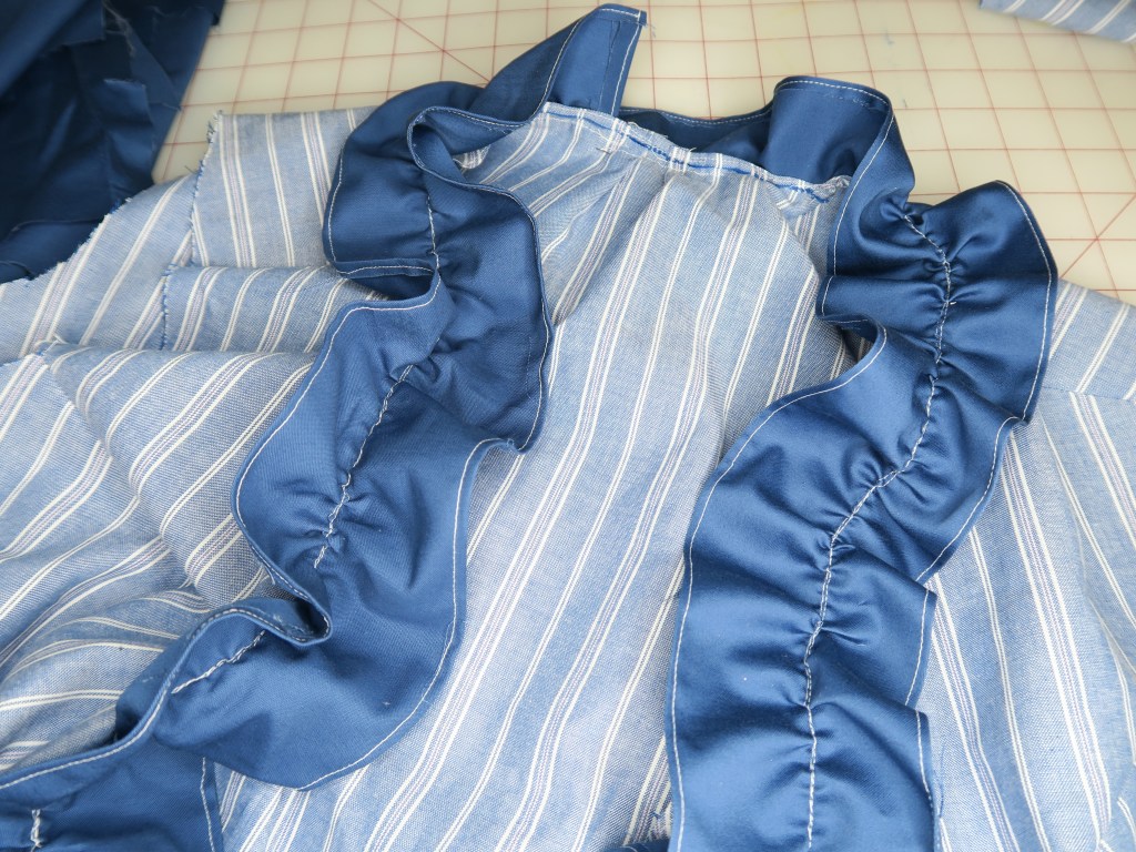 The belt and ruffles kind of, sort of go together? I was going to eliminate the belt, but since I cut it already, I sewed it in.