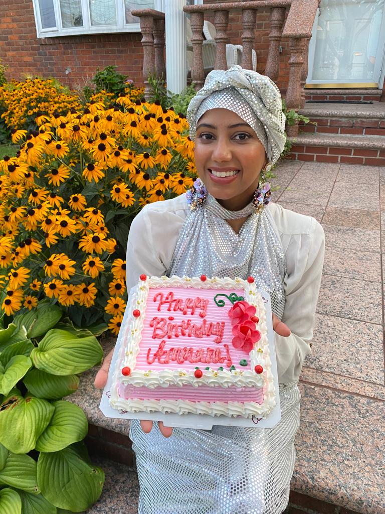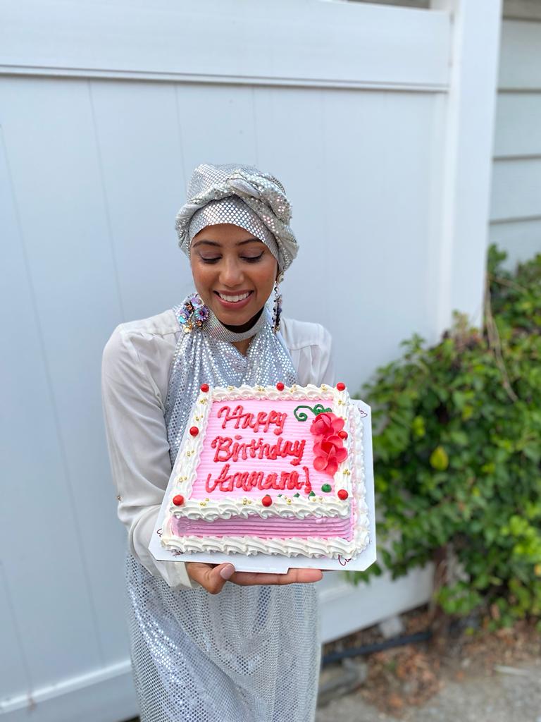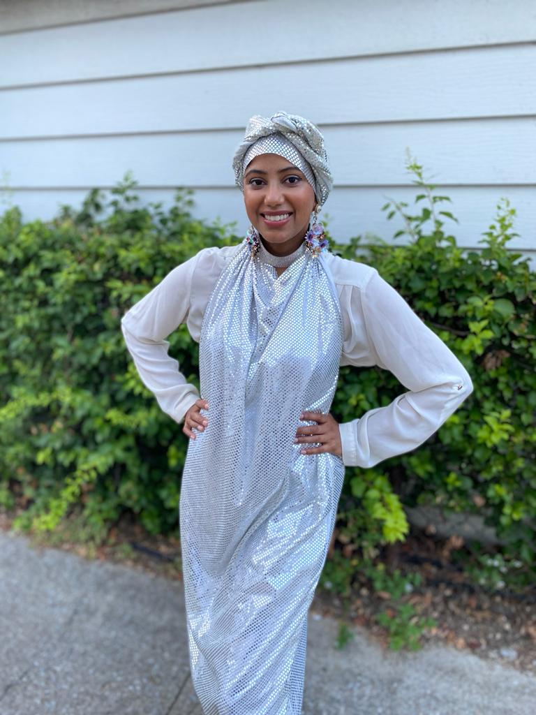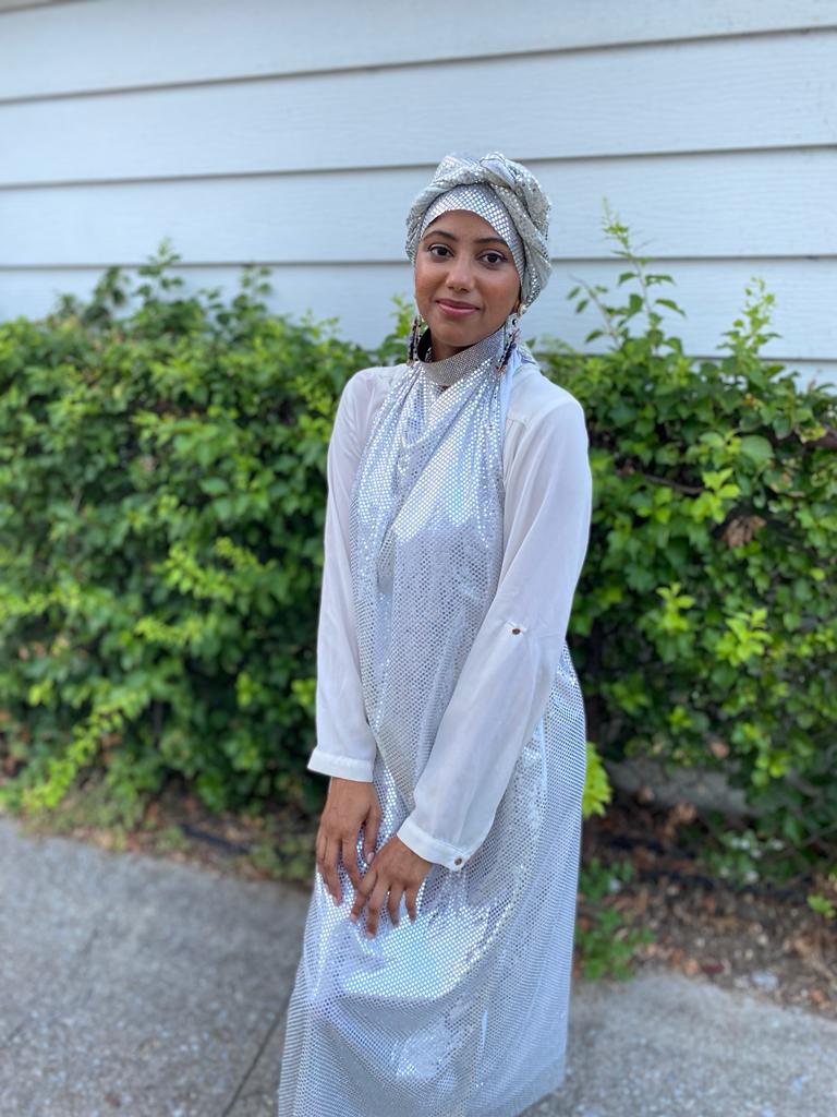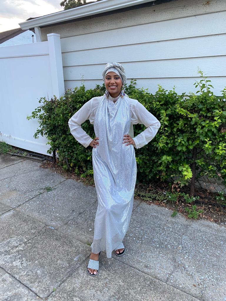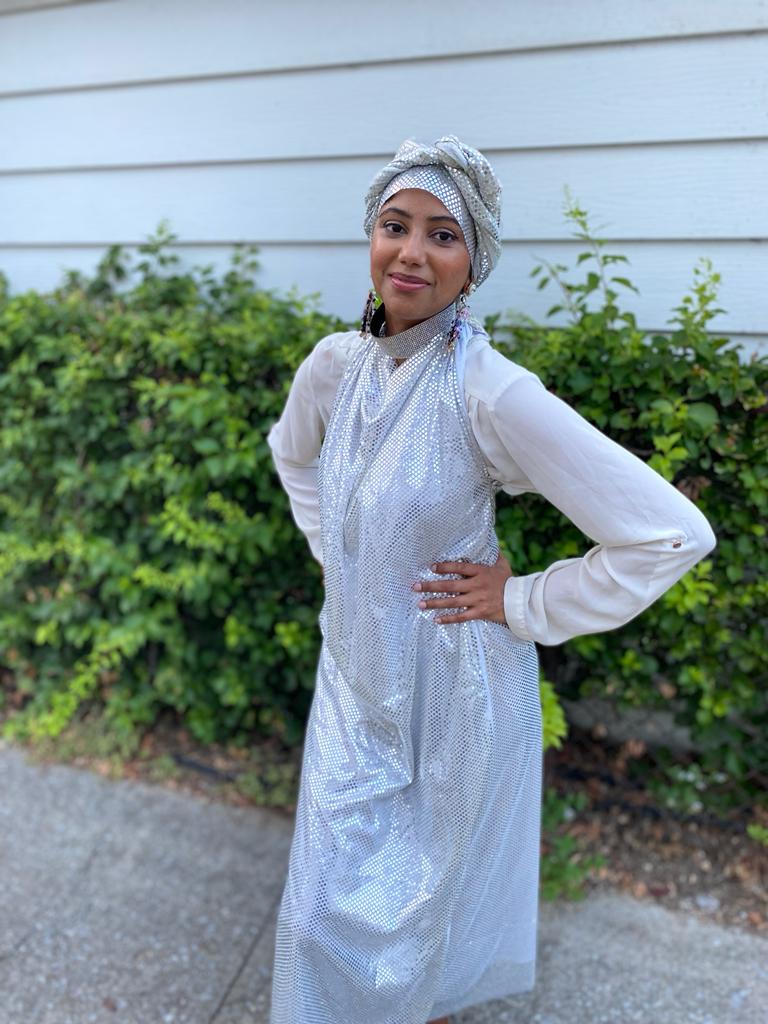 I styled my sequin cowl neck birthday dress with a white blouse, sparkly earrings, and a turban style of the same fabric.