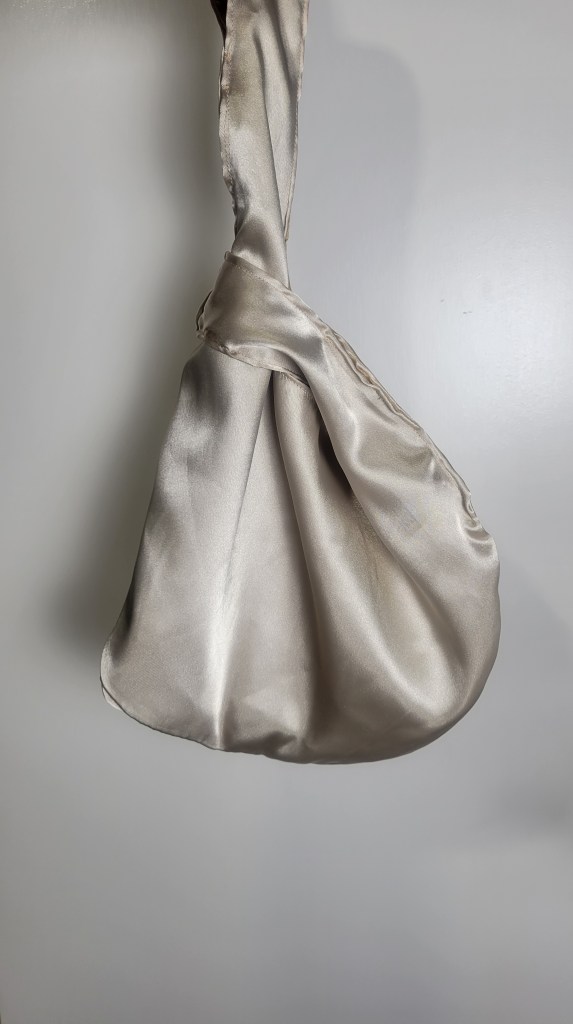 Hey friends! I made this Japanese Knot Bag for my cousin. It’s made from an ivory satin fabric and two lining fabrics to give the satin more structure.